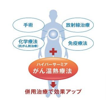 ヒトの細胞は、42.5℃以上の温度で死滅します。これは、がん細胞も同様です。通常の細胞は、温度の上昇を防ぐために血流を増やすのに比べ、がん細胞は血管の拡張が無く血流が少ないので蓄熱しやすく、正常な組織よりも高い温度になります。さらに、体表近くにある浅在性悪性腫瘍は温めることでがん細胞のみを死滅させるので、腫瘍を縮小させる効果が期待できます。体内の中にある腫瘍(深在性腫)は40℃前後の温度上昇によって放射線治療や薬物療法(化学療法や抗がん剤治療、分子標的薬、免疫チェックポイント阻害などの治療)の効果を高めることが可能です。また、放射線治療による効果を高めることにより、腫瘍内部で抗がん剤の濃度が上昇することが報告されています。