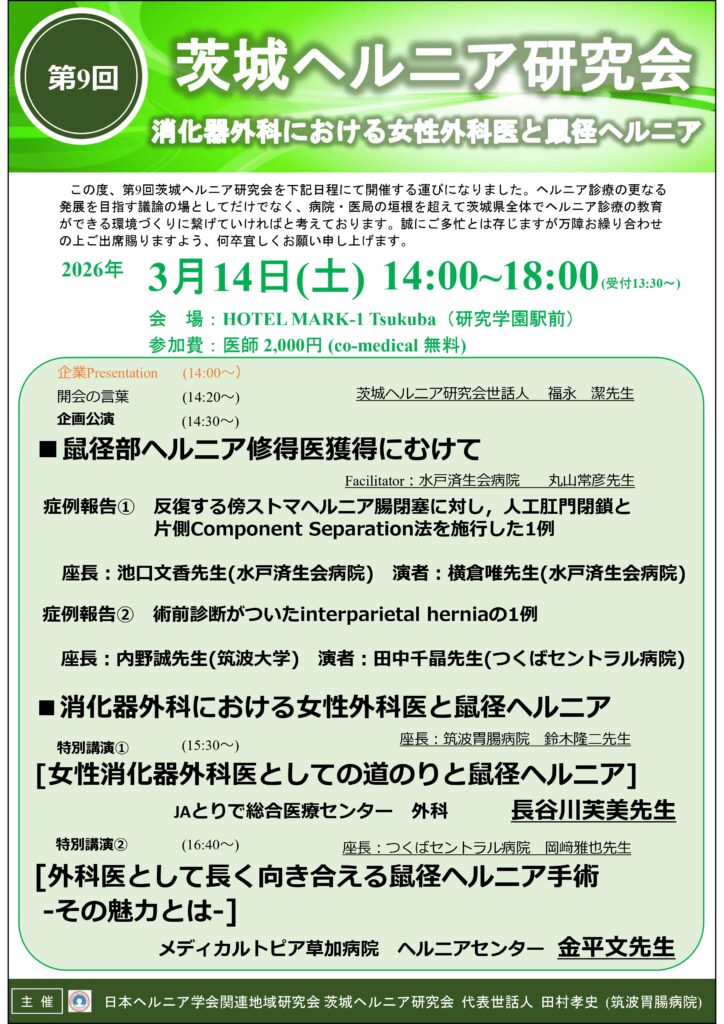 第9回 茨城ヘルニア研究会が下記の通り開催されます。